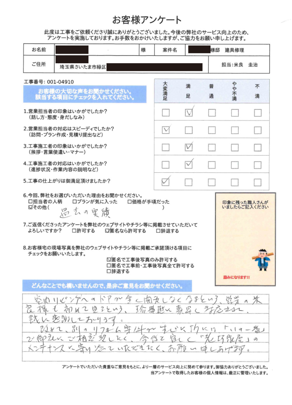 室内リビングへのドアが全く開閉しなくなるという、営業の米良様も初めて見るという、珍事態に素早く対応され、誠に感謝しております。