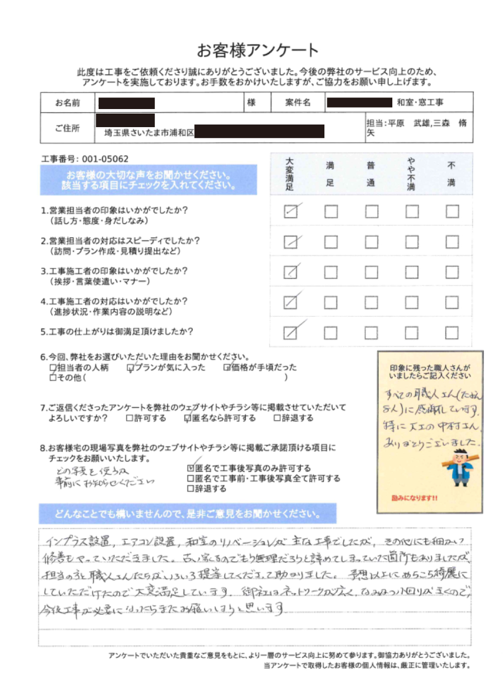 工事の仕上がりは御満足頂けましたか