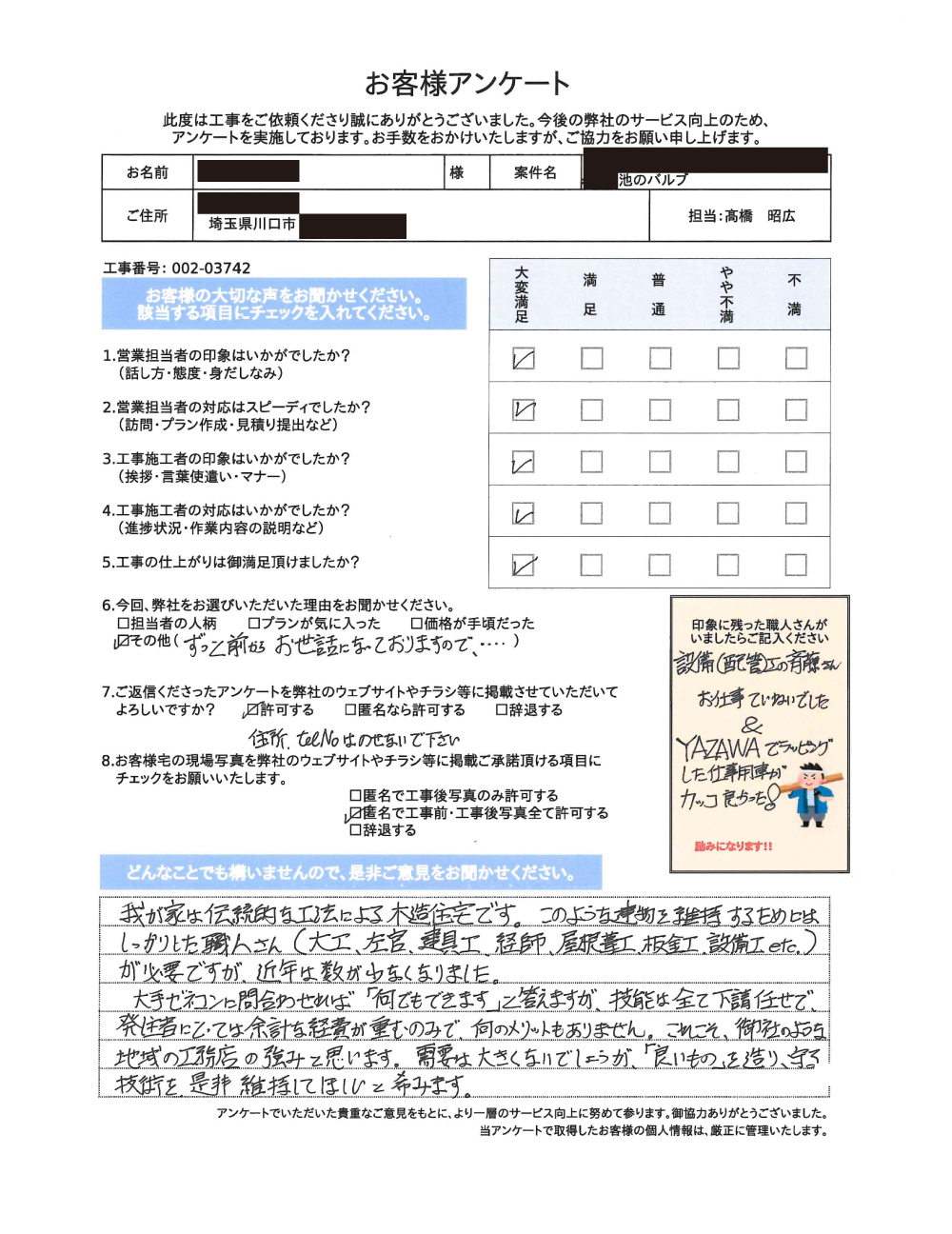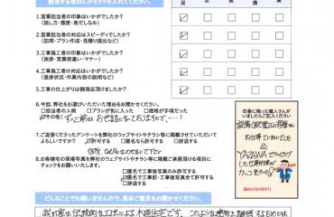 このたびは即決で工事をお任せ頂きありがとうございました。お客様のお話しはいつも大変勉強になります。職人や技術者不足のなか「良いものを造り、守る技術」の維持、改善に今後も努めて参ります。今後ともお住まいのお困りごと何なりとご相談下さい。斉藤さん(YAZAWAさん)おほめ頂きありがとうございました!
