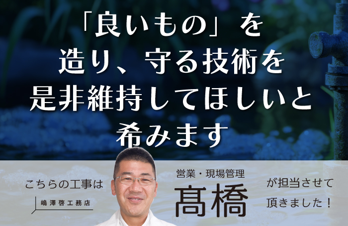 大手ゼネコンに問合せれば「何でもできます」と答えますが、技能は全て下請任せで、発注者にとっては余計な経費が嵩むのみで、何のメリットもありません。これこそ、御社のような地域の工務店の強みと思います。需要は大きくないでしょうが「良いもの」を造り、守る技術を是非維持してほしいと希みます。
