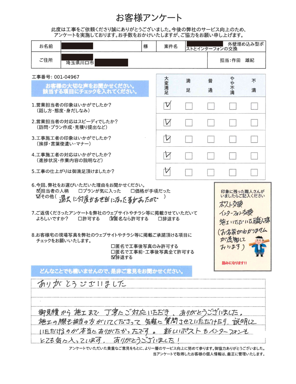 この度は工事のご依頼ありがとうございました。