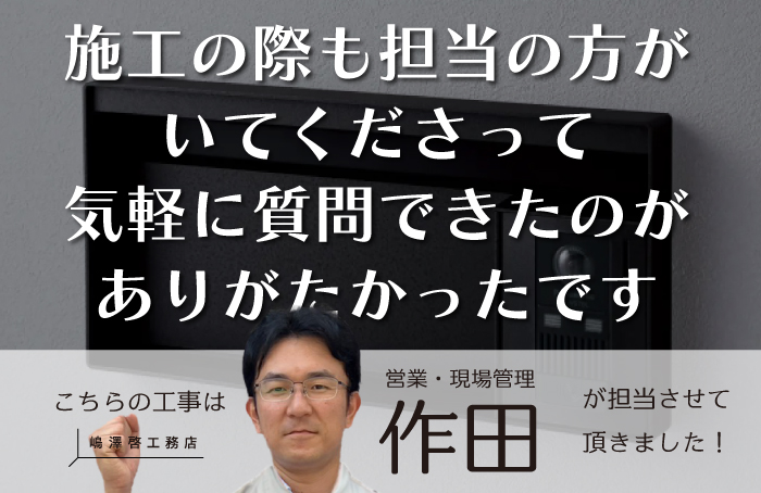 施工の際も担当の方がいてくださって気軽に質問させていただけたり、説明していただけるのが本当にありがたかったです。新しいポストもインターフォンもとても気に入っています。ありがとうございました!